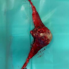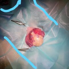 Zu jeder Impfung gehört eine Allgemeinuntersuchung. Mit 6 Jahren gehört Lotti zu den älteren Kaninchen und gerade bei Weibchen kommen dann Gebärmutterprobleme häufig vor. Bei der Allgemeinuntersuchung fiel mir dann eine etwa faustgroß derbe Umfangsvermehrung auf (so heißt medizinisch erst einmal alles, was nicht da sein sollte). Wir haben geröngt und Blut genommen, nicht, dass da noch eine Überraschung zu Tage tritt und haben schon im Röntgen gesehen, dass da etwas ganz und gar nicht stimmt. Lotti hatte eine kalzifizierte Umfangsvermehrung im Bauch. Das kann jetzt einiges sein, daher hat ein sehr netter Kollege einmal mit dem Ultraschall genauer nachgeschaut und der Verdacht eines Gebärmuttertumors war dann sehr stark. Im Blutbild zeigte sich eine heftige Entzündung, was nicht so ganz zu einem Tumor passt. Lotti wurde mit Schmerzmitteln und einem Antibiotikum abgedeckt und innerhalb einer Woche wurde sie auch zunehmend schmerzhaft, das zeigt sie trotz Schmerzmitteln deutlich. Die Kastration ging einfach und besser, als wir dachten, aber sie war deutlich schwieriger, als eine normale Kastration, denn Tumore haben eine ganz unangenehme Eigenart : Sie werden mit Blut versorgt und es sind meist sehr dicke Blutgefäße. Der Tumor ist 6x4x5cm groß und wiegt knapp 100g (viel bei gerade 1.8kg Gesamtgewicht). Zum Glück dürfen wir den Tumor auch einschicken, es steht einiges im Raum und wir wollen schon wissen, wie es prognostisch aussieht. Das Ergebnis zeigt einen bösartigen Tumor, wie es leider bei den Weibchen häufig vor kommt. Die Ränder sind sauber, an einer Stelle war er leider offen, das haben wir in der OP bereits gesehen.