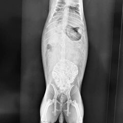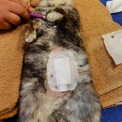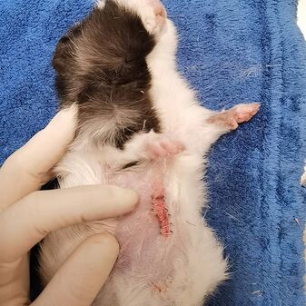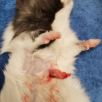Im Mai 2021 kam ein Meerschweinchen mit knapp 300g aus Außenhaltung mit einer blutenden Wunde am Bauch. Auf dem ersten Blick war ich mir nicht sicher ob Brustkorb oder Bauchhöhle, für Brustkorb hat es aber zu gut geatmet. Also erst einmal Schmerzmittel und stabilisiert. Abends nach der Sprechstunde noch in Narkose gelegt und geschaut wohin das Gebilde zieht. Es ist ein Teil des großes Netzes aus der Bauchhöhle gewesen. Wir haben eine große Wunde gefunden, den dreckigen Teil abgebunden, abgesetzt und die Bauchorgane weiter kontrolliert. Dann wurde die Bauchwunde mehrschichtig verschlossen. Leider fand die sehr junge Dame die klammern super und hat sich nachts alle raus gebastelt, so dass wir heute morgen nochmal nähen durften. Zum Schutz der Naht hat sie einen Bauchverband an bekommen.