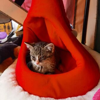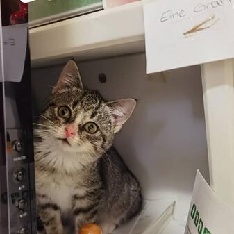 Es handelt sich um eine kleine Europäisch Kurzhaar Katze, ca. 6 Wochen jung. Hochgradig Flohbefall (der ist bereits unter Kontrolle), Katzenschnupfen, verwurmt, viel zu dünn und anfangs sehr skeptisch gegenüber dem Menschen. Aber wer kann es ihr verdenken? Minime durfte rund 8 Wochen die Praxis unsicher machen, hat viele Tiere und viele Menschen kennen lernen dürfen und wir konnten uns ein Bild machen, wohin die kleine Katze am liebsten ziehen möchte. Sie hat uns sehr deutlich gemacht, dass sie nach draußen gehen mag, auf andere Katzen gerne verzichten möchte und jemanden braucht, der viel mit ihr spielt Sie hat nach einiger Suche das perfekte Zuhause gefunden und wir sehen sie weiterhin ab und an.