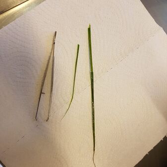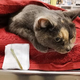 Heutiger Notfall, kurz vor Ende der Sprechstunde ein Anruf, dass es der Katze nicht gut geht. Freigänger und seit sie nach Hause gekommen ist spuckt sie und versucht zu erbrechen. Der Verdacht eines Fremdkörpers war schnell da, die Katze beim Abtasten des Halses sehr empfindlich und der Rachen sehr rot war. Also musste Katze einmal in Narkose (Feierabend hin oder her) und wir machen uns auf die Suche. Im Rachen hinter dem weichen Gaumen wurden wir fündig, der Grashalm war sehr steif, was das hinaus basteln sehr schwierig gestaltete. Solches hartes Gras wird gerne im Fellwechsel gefressen, klappt dann oben an den Gaumen und bleibt durch die feinen Haare im Gras am Gaumen kleben. Wir können uns alle vorstellen wie unangenehm das wird. Einer der kleinen Zipfel reichte bis hinter die Nasenflügel in die Nase hinein... Ein langer Weg. Die gute war schnell wieder wach und durfte ohne Gras in der Nase nach Hause.