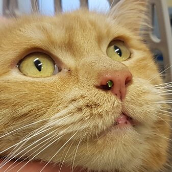 Der rote Kater kam ebenfalls mit plötzlichen Niesanfällen, bei ihm haben wir den Grashalm so an der Nase bereits erkennen können, hier konnten wir ohne Narkose gleich 2 Grashalme ziehen. Hier muss man schauen, ob die Katze das kurze festhalten mit macht oder ob sie aus Unsicherheit beißen möchte. Zu unserem Schutz muss deswegen manchmal die Katze kurz schlafen gehen.